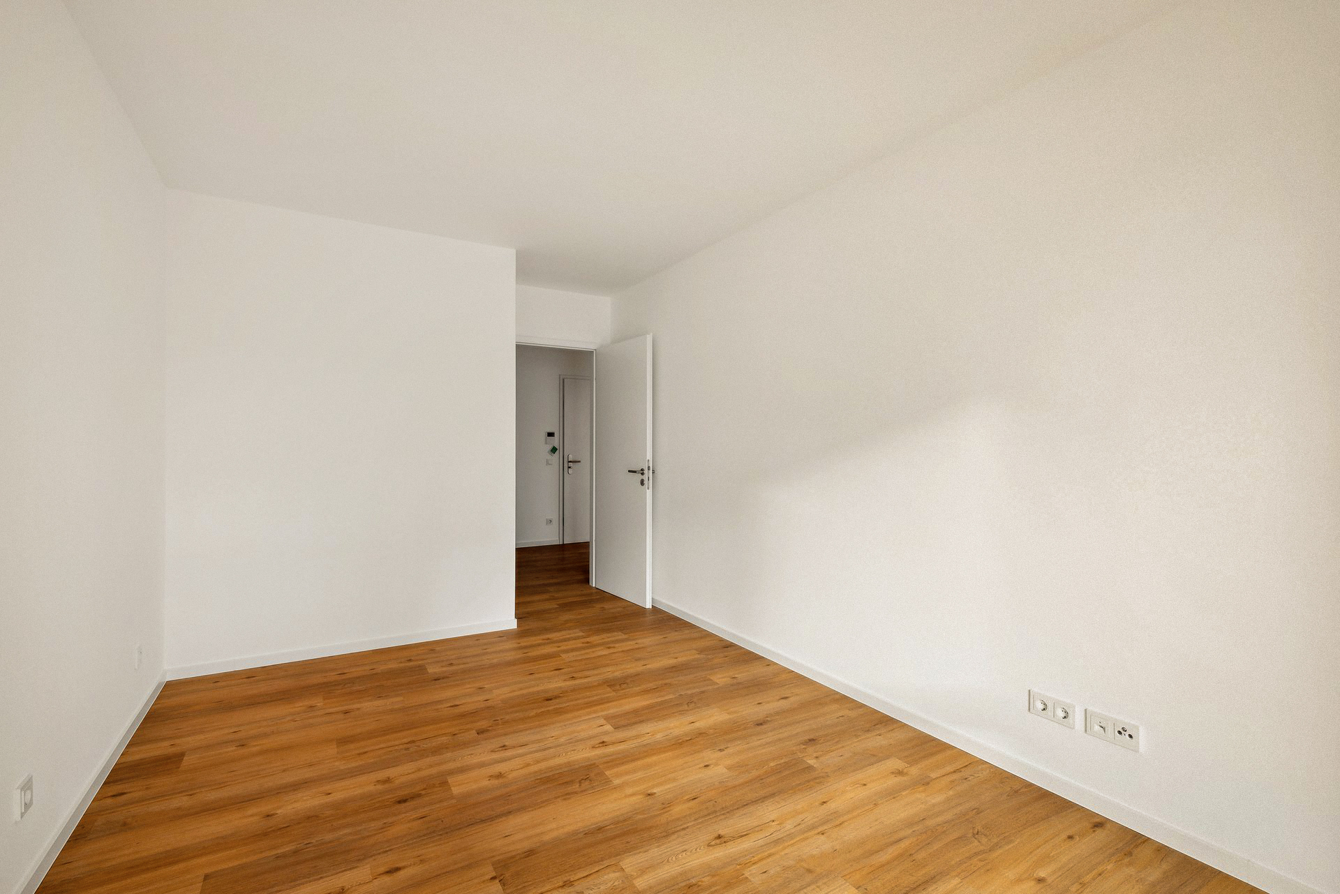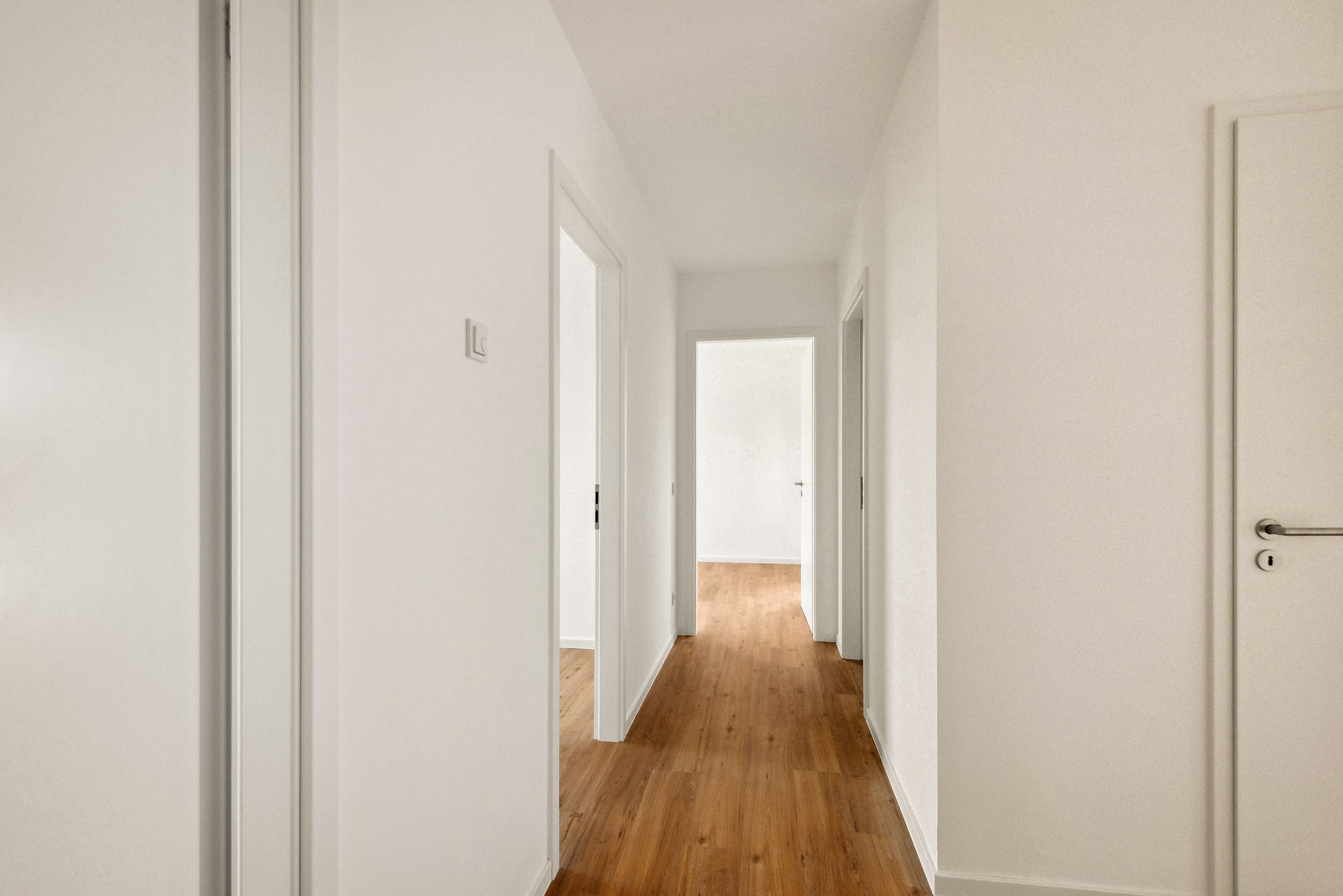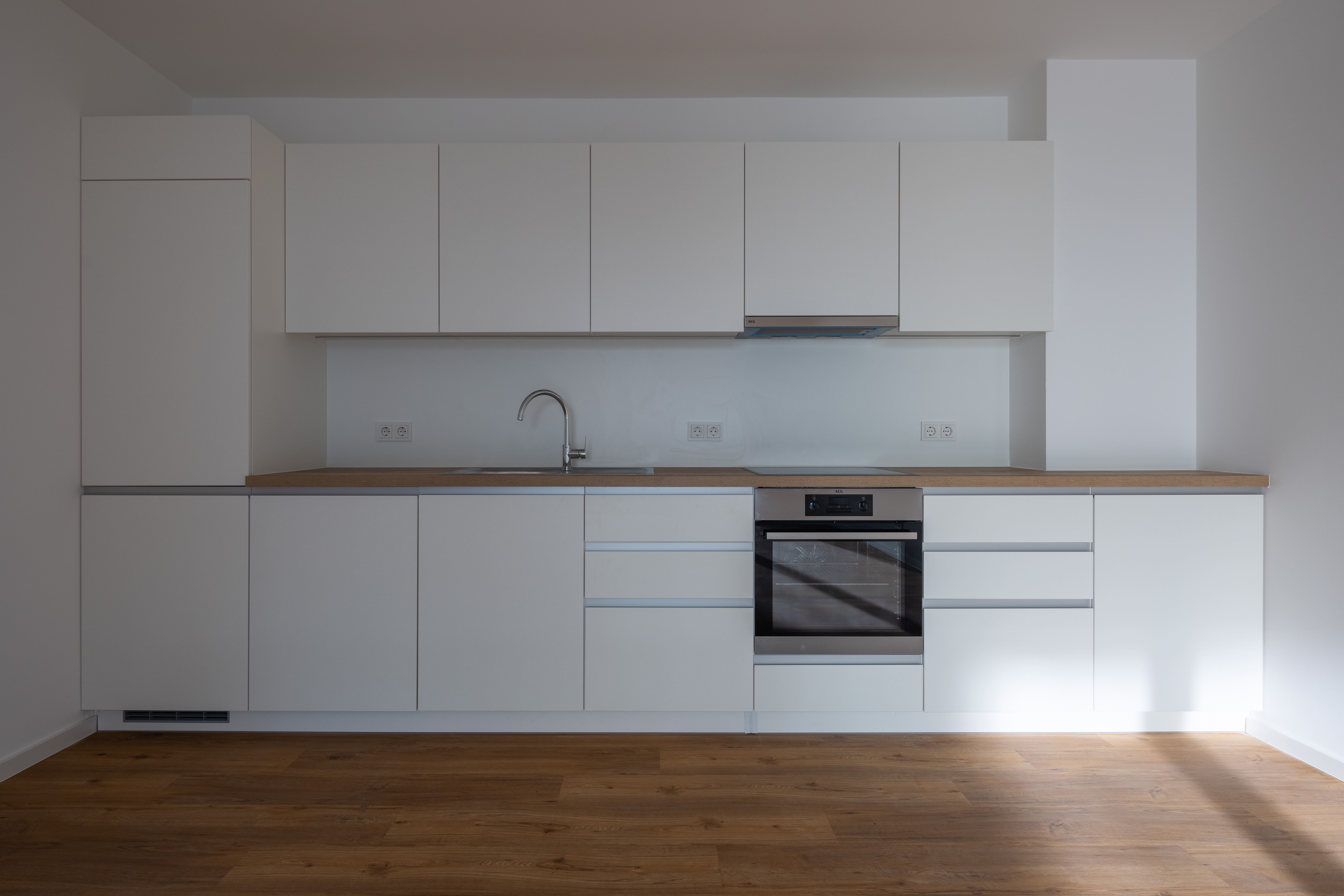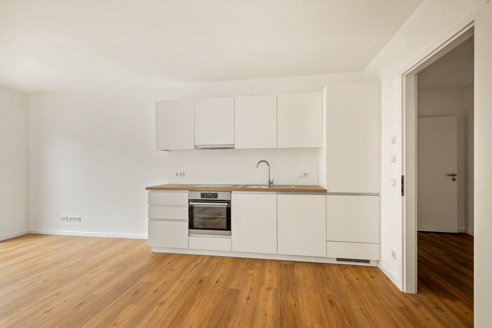 - Wohnungen: hochwertiges Vinyl in Plankenverlegung, Übergangsschiene aus Edelstahl, weiße Sockelleisten mit Weichlippe und durchgefärbte Wand- und Bodenfliesen in grauem Steineffekt