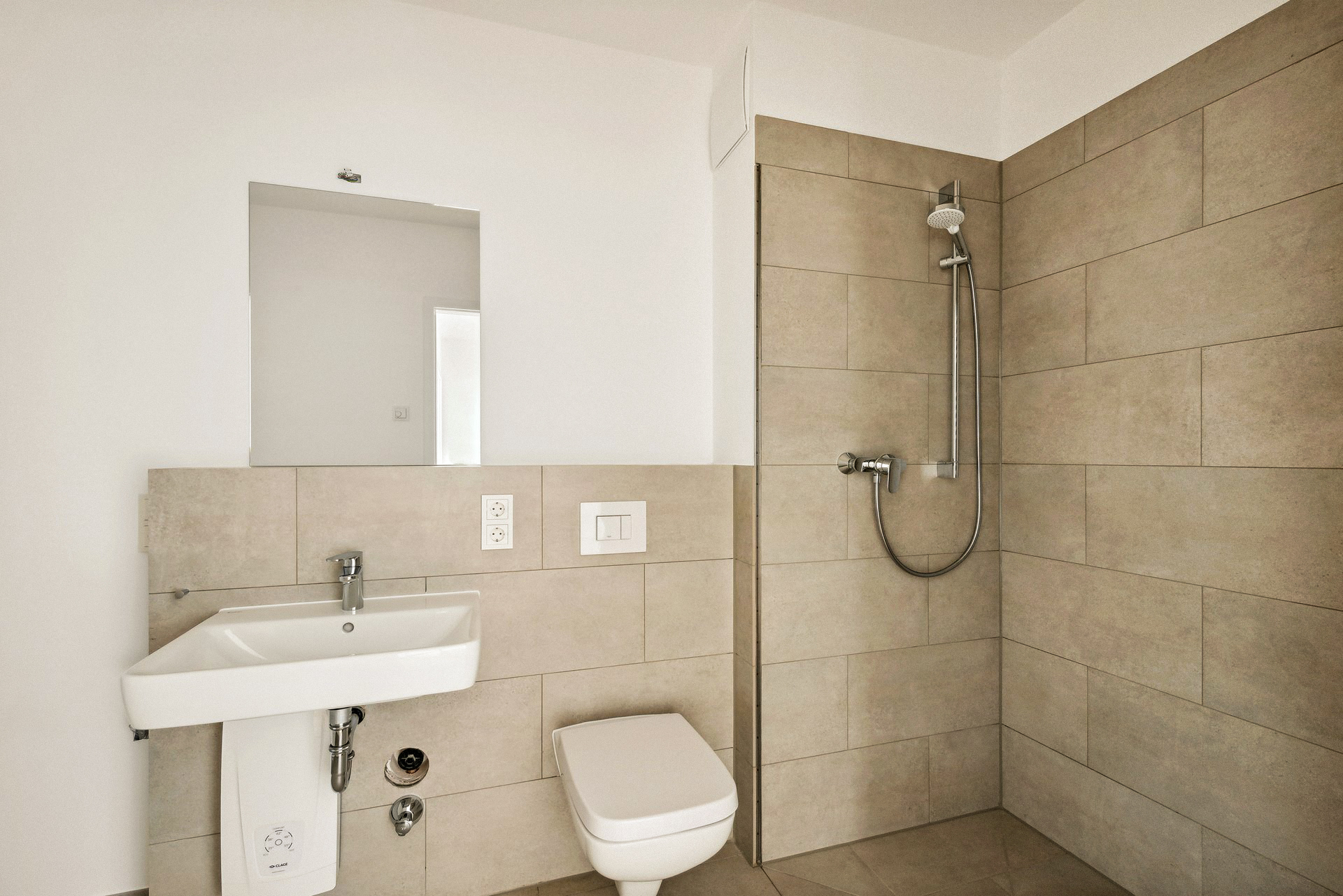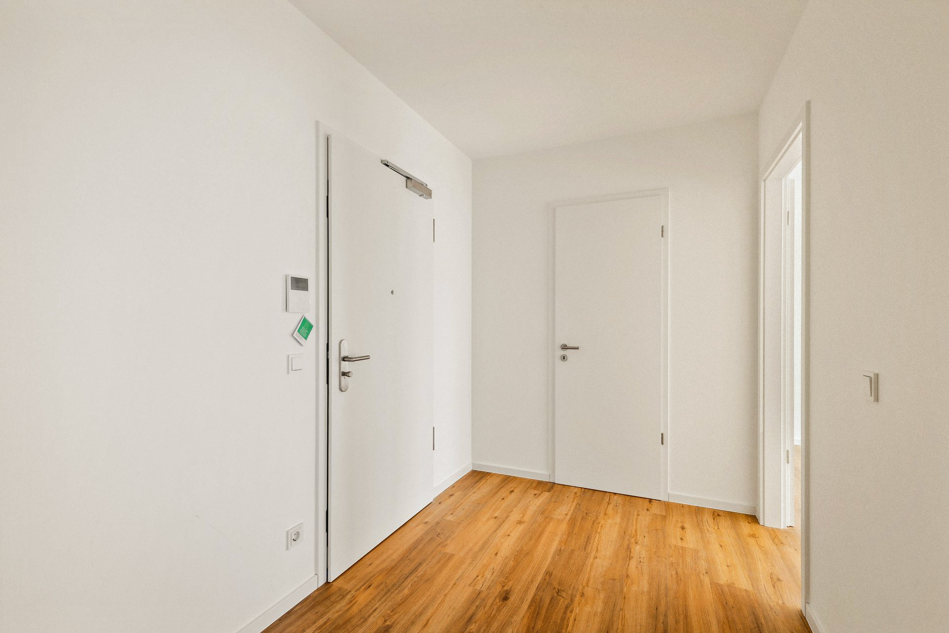 - Appartments: high-quality vinyl planks, stainless steel transition rail, white skirting with soft lip and solid-color, gray stone-effect wall and floor tiles.