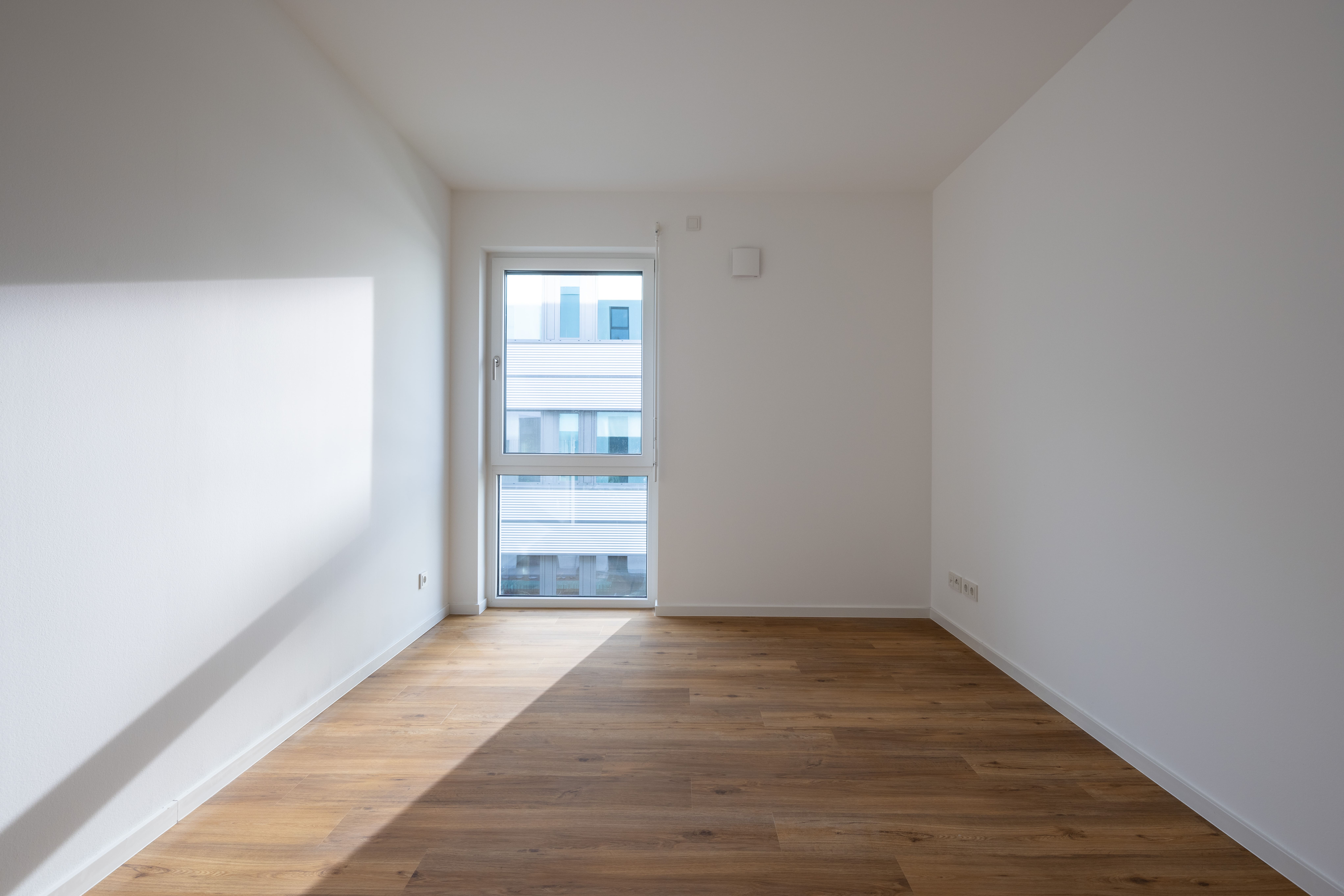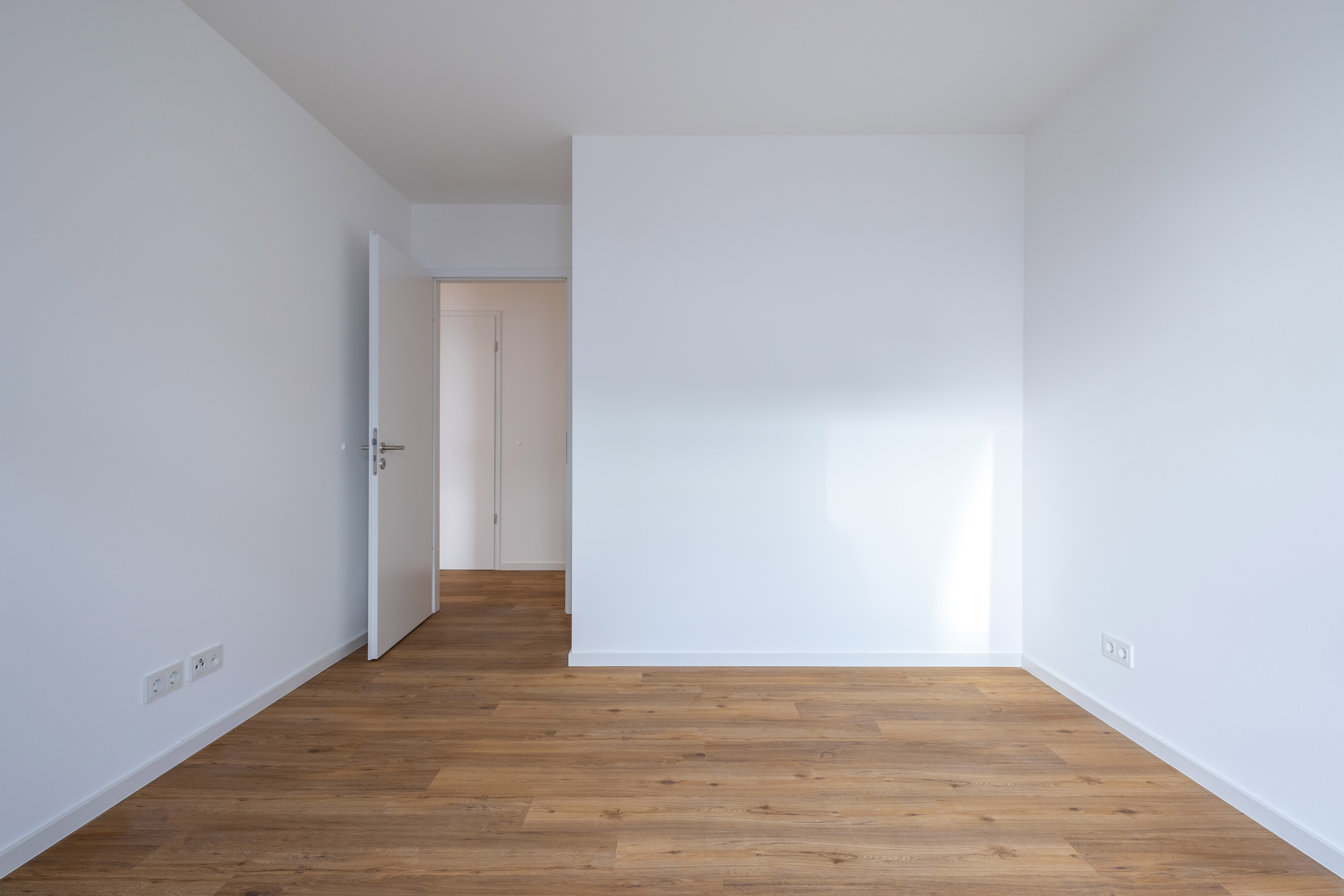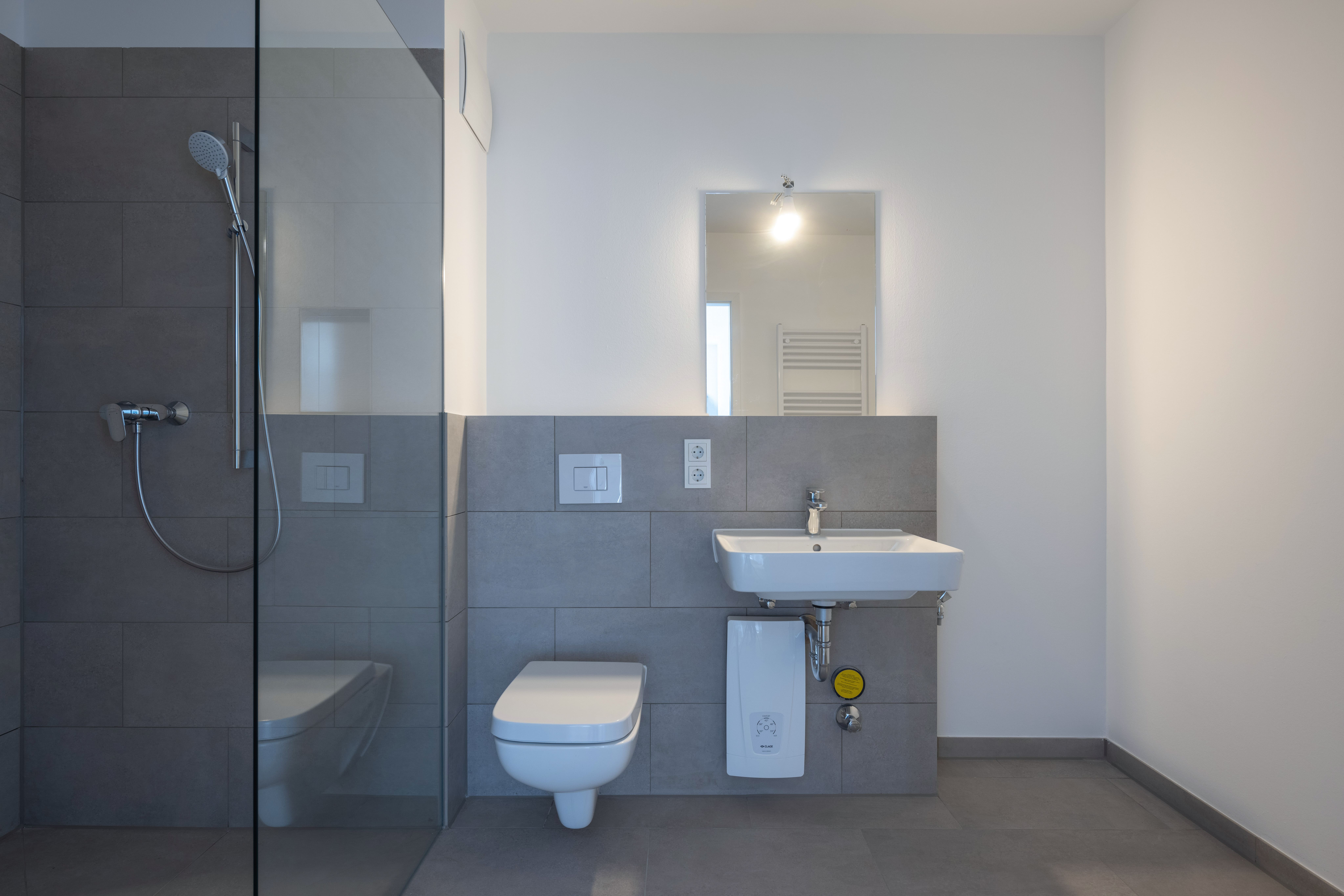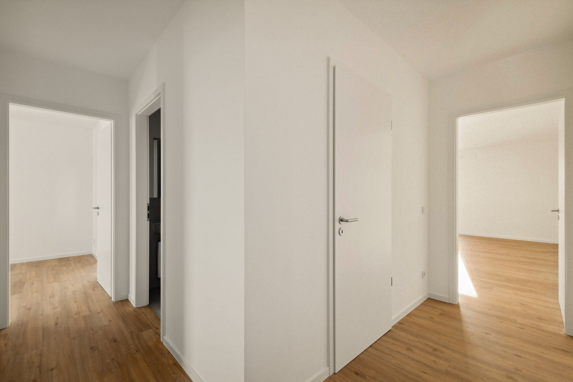 - Wohnungen: hochwertiges Vinyl in Plankenverlegung, Übergangsschiene aus Edelstahl, weiße Sockelleisten mit Weichlippe und durchgefärbte Wand- und Bodenfliesen in grauem Steineffekt