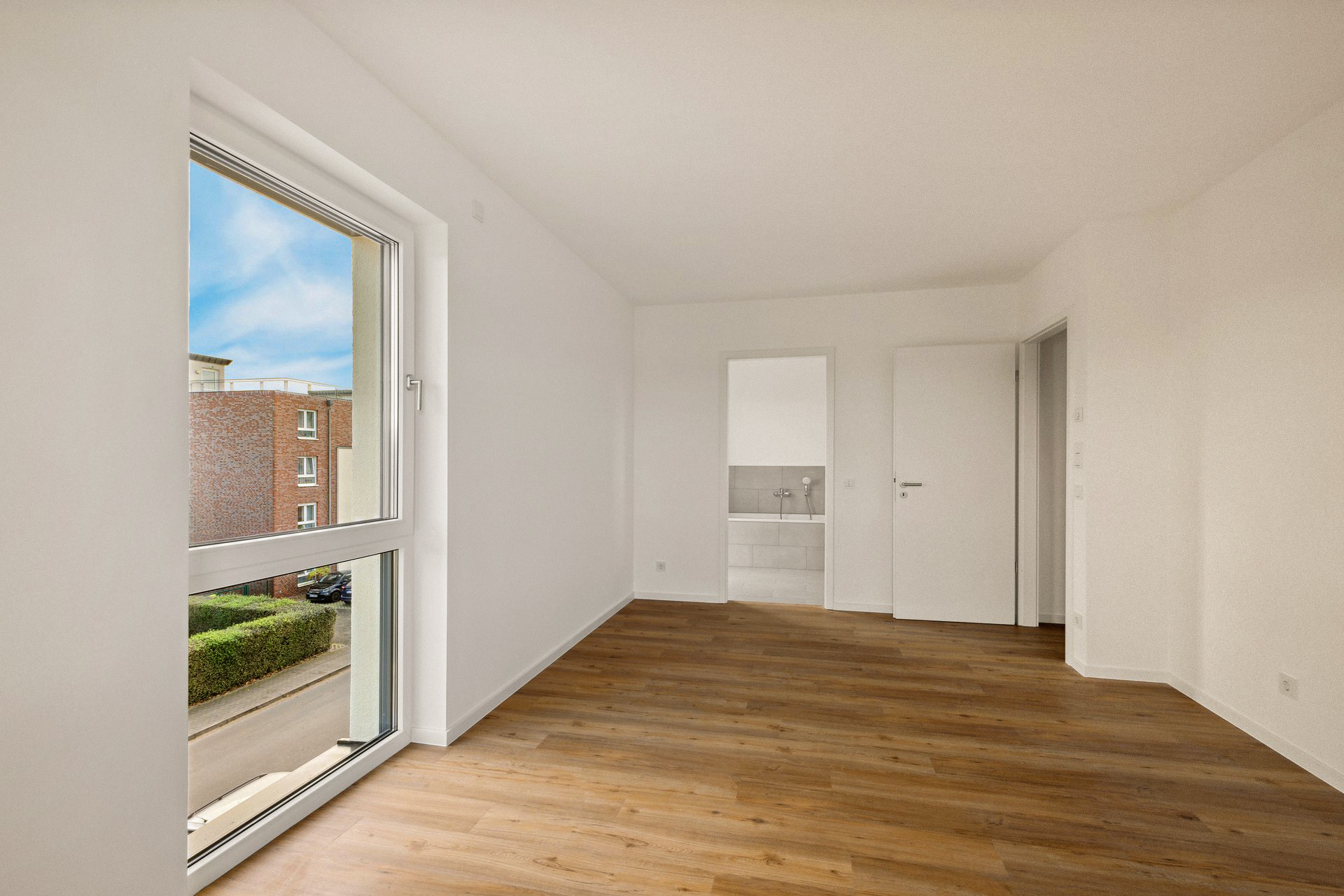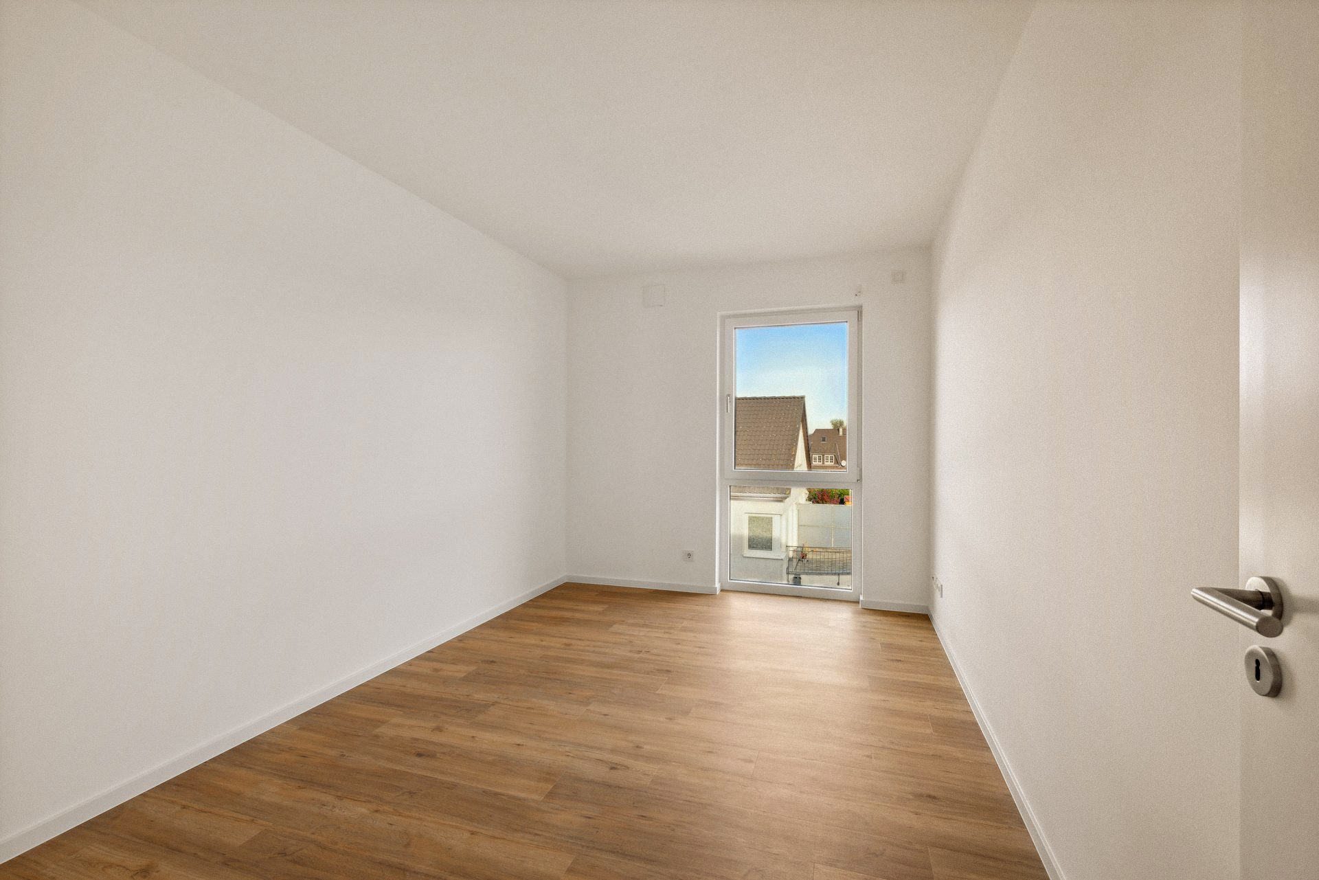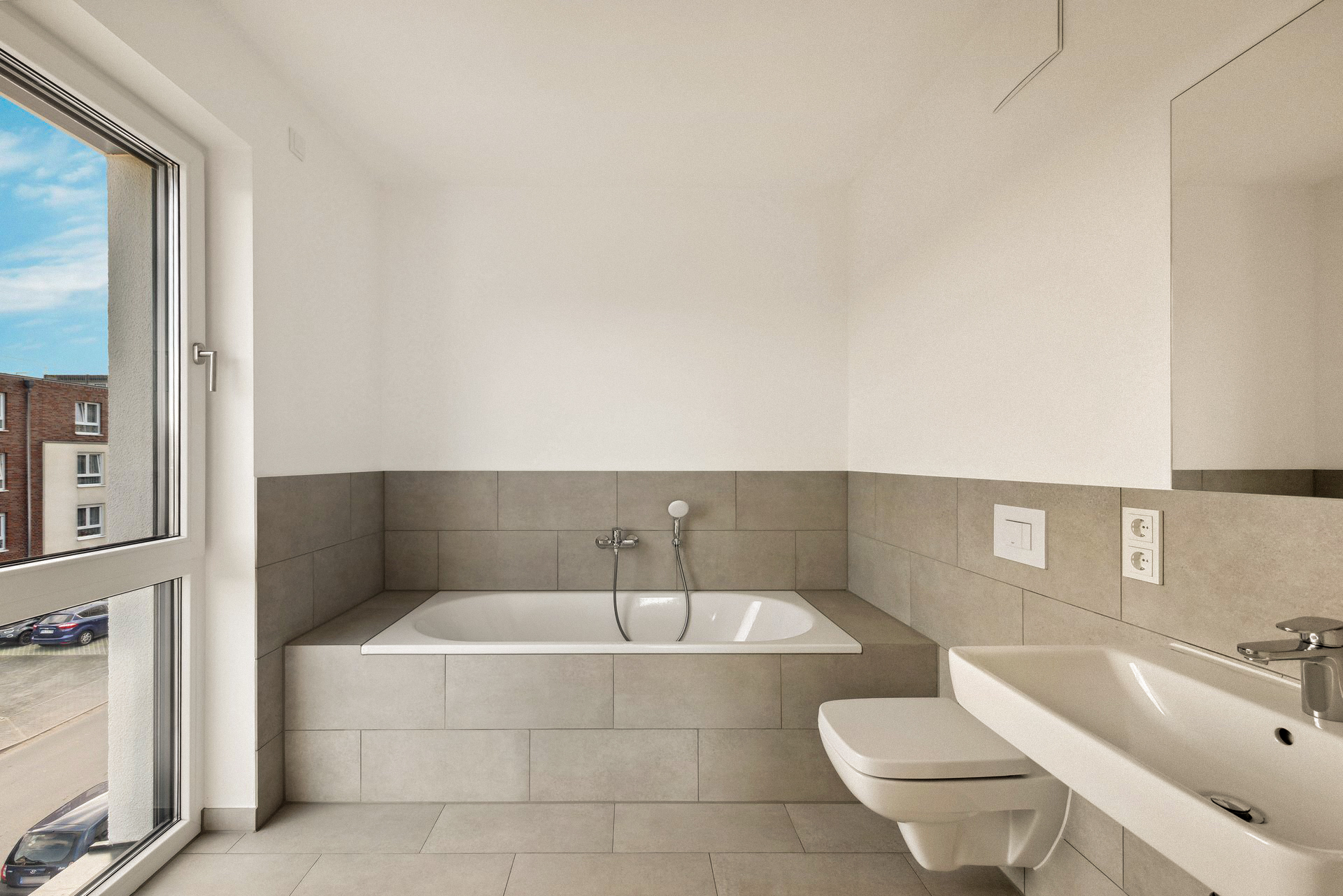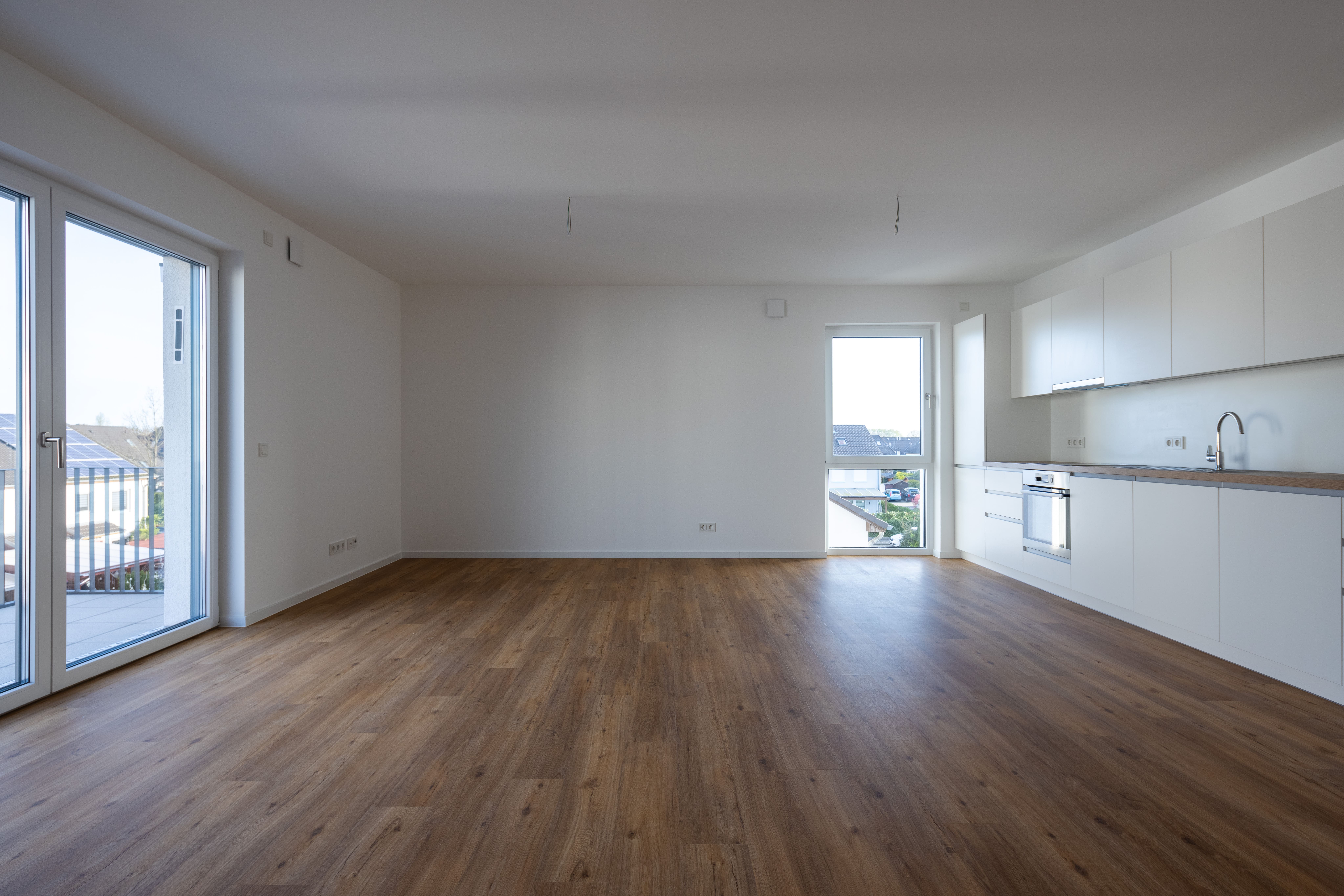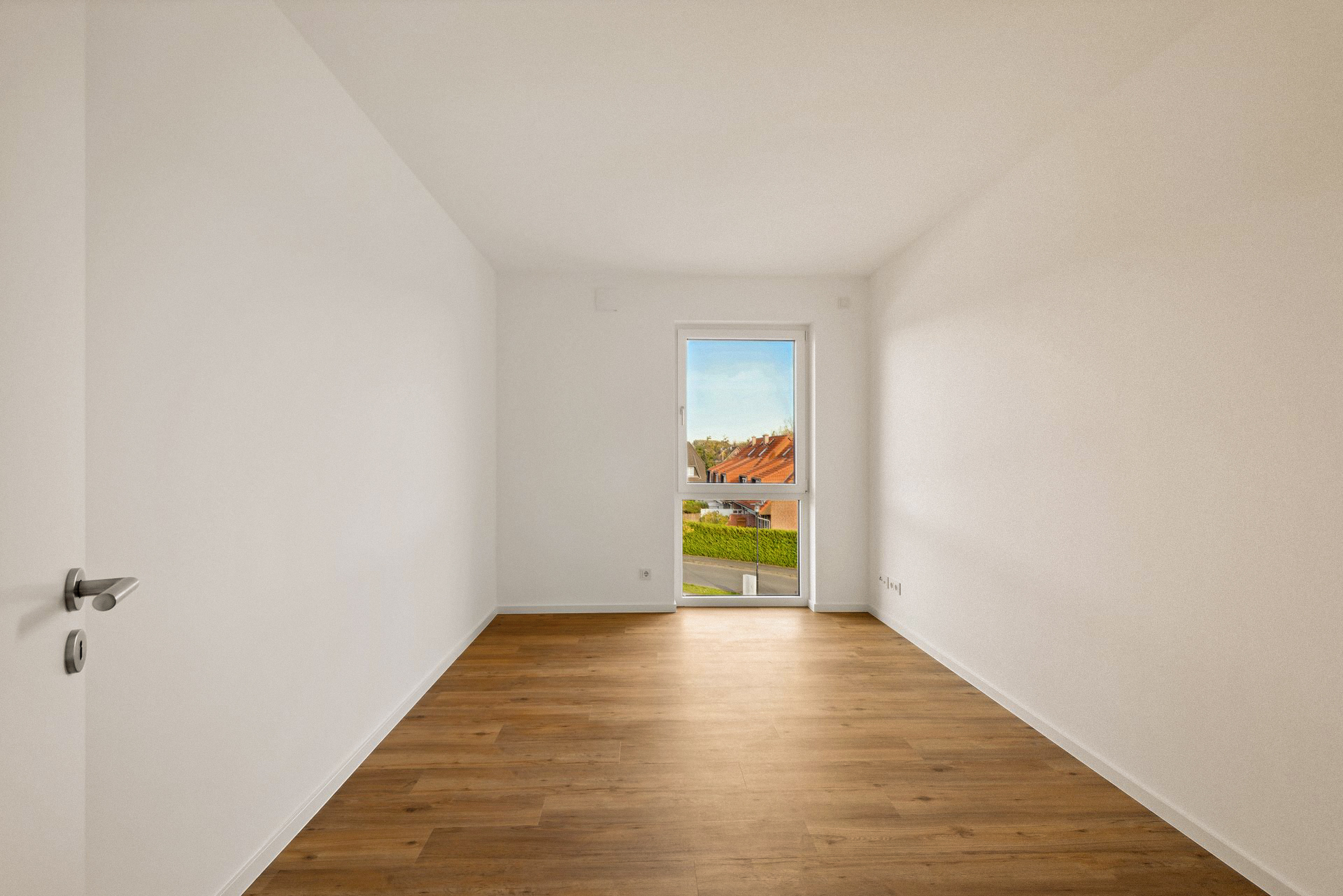 - Wohnungen: hochwertiges Vinyl in Plankenverlegung, Übergangsschiene aus Edelstahl, weiße Sockelleisten mit Weichlippe und durchgefärbte Wand- und Bodenfliesen in grauem Steineffekt